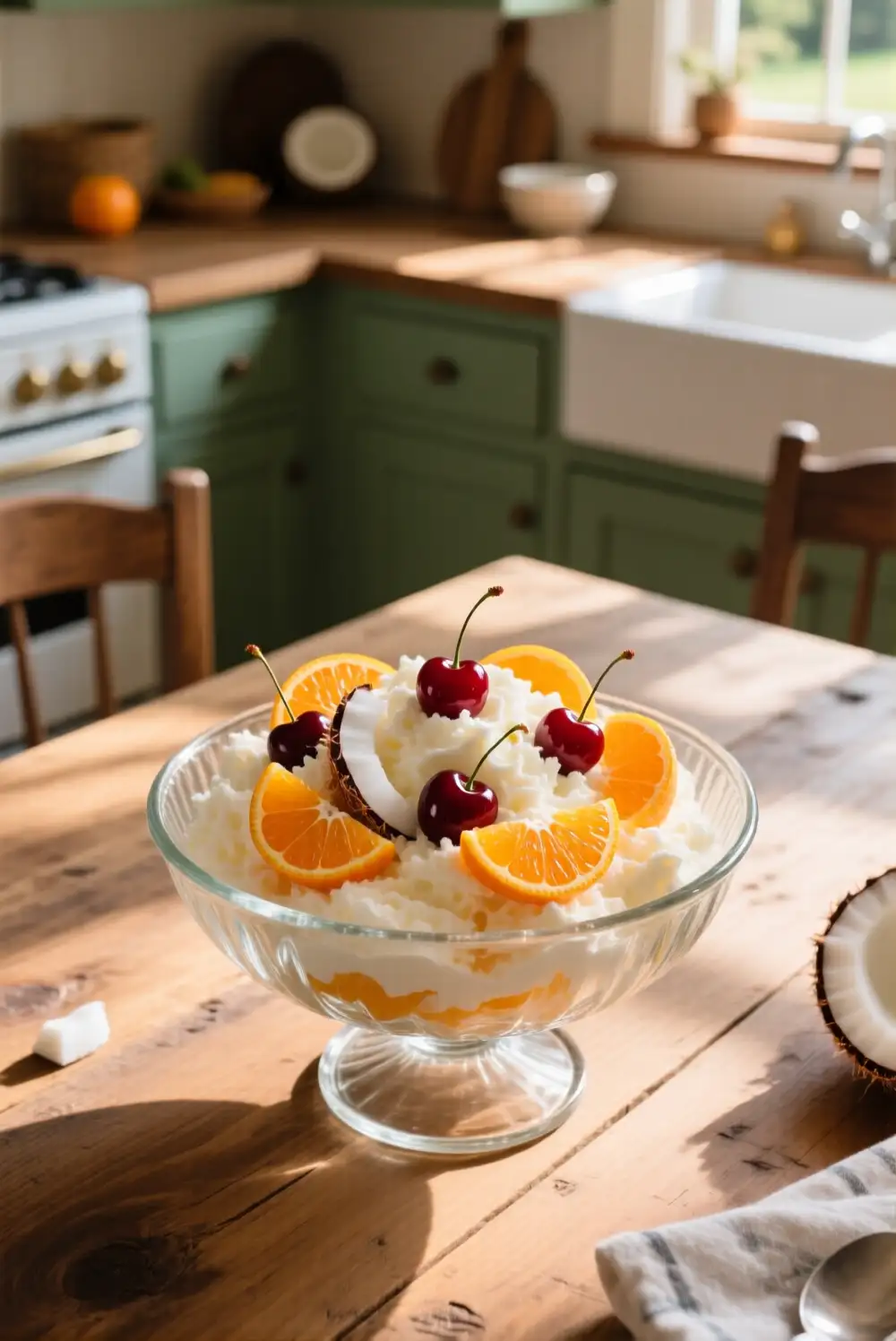 The Classic Ambrosia Fluff is a staple of Southern hospitality and vintage charm. This version focuses on high-quality ingredients like shredded coconut, juicy mandarin oranges, and maraschino cherries folded into a cloud of whipped cream. It is the perfect representation of slow living because it requires just a few minutes of prep but brings immense joy to everyone at the table. The textures are varied, offering a delightful crunch against the soft, pillowy marshmallows.